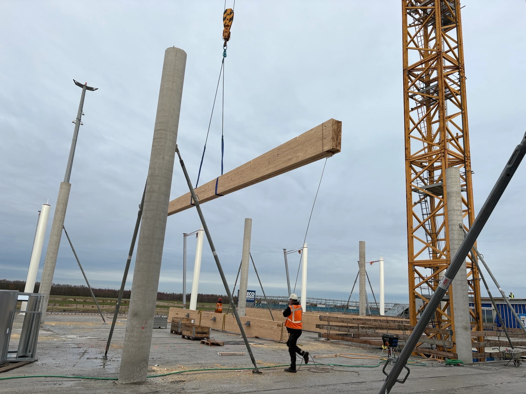 De dakliggers (elk 28 meter lang) worden geplaatst op de betonnen kolommen die het dak gaan dragen. Ze worden rechtstreeks vanaf de vrachtwagen met een kraan op de juiste plek gehesen. Het leggen van de eerste dakplaten staat binnenkort gepland. Eind februari ligt de begane grondvloer erin. In de bagagekelder is goed zichtbaar hoeveel ruimte er straks bijkomt. Bouwmedewerkers plaatsen de leidingen voor installaties (luchtbehandeling, Sprinkler en elektriciteit) en monteren geveldelen van de pui. In januari wordt het glas voor de eerste verdieping geplaatst. Ondertussen wordt de fundering voor het entreegebouw uitgegraven.
