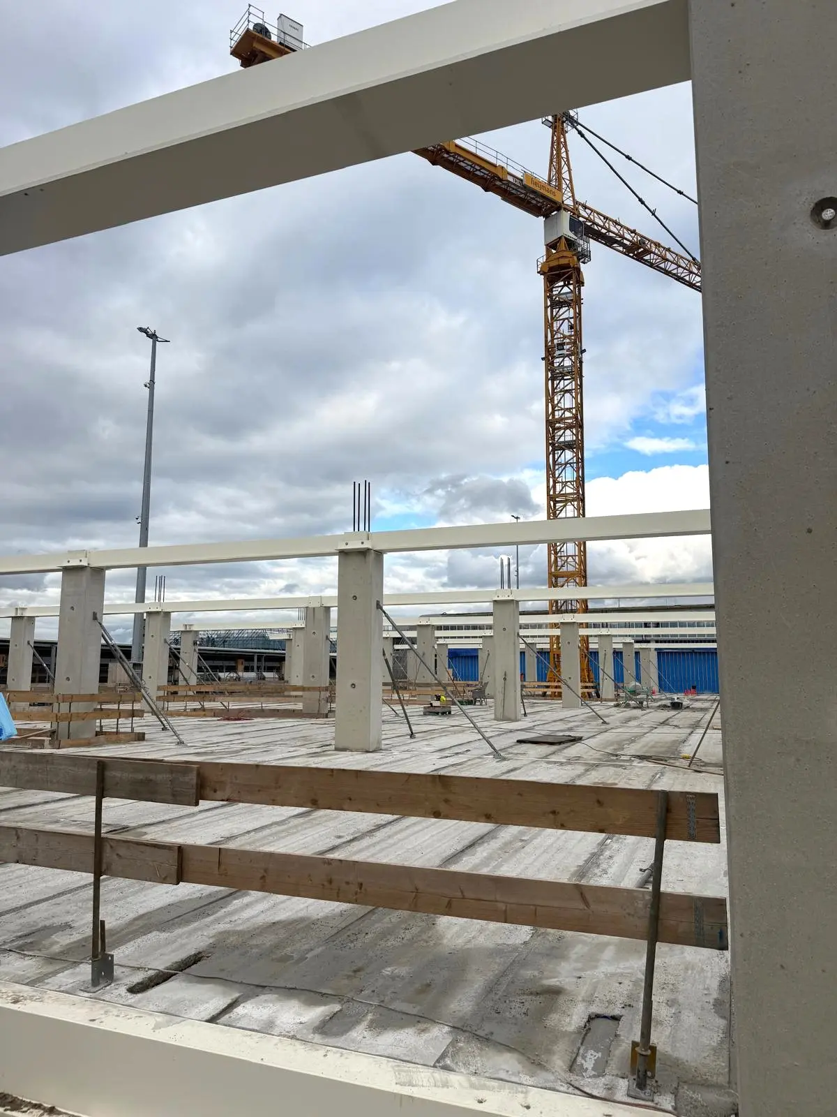 We zijn de hoogte in! De begane grondvloer ligt erin. Er zijn voor de begane grond tientallen prefab kolommen en prefab wanden geplaatst. Nu worden de stalen balken van de eerste verdiepingsvloer geplaatst. Naar verwachting zit die klus er eind oktober op waarna er weer prefab kolommen en wanden geplaatst worden voor de eerste verdieping. Op naar het hoogste punt!